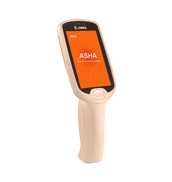 With ASHA, Grzegorz pronounces 'angle ridge tile' in Polish and is led to it by the device. He scans the product and receives at the till.